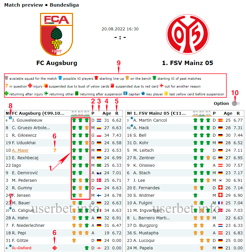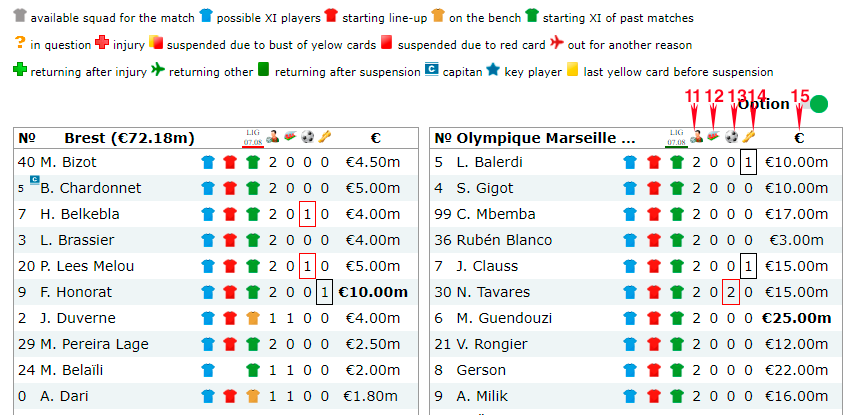 1 - Для наглядности и понимания роли игрока в команде, напротив фамилии, выводятся 3 последние игры команды, где зеленая маечка - игрок начинал матч в стартовом составе, а желтая маечка - игрок начинал матч на скамейке запасных.
