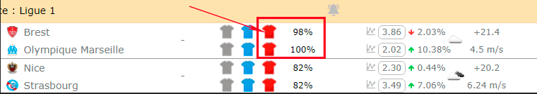 Стартовые составы команд, как правило, появляются за 65-45 минут до начала матча в различных источниках. Наша команда согласно расписанию, в автоматическом и ручном режиме мониторит за появлением. О наличии стартовых состав команд сигнализирует иконка - красная маечка. Рядом с иконкой будет отображаться процент "Оптимального стартового состава". Данный процент считается так: