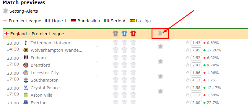 Если, вы хотите получать оповещение по конкретным лигам, то для этого необходимо в разделе Match previews в заголовке по Лиге кликнуть на "Колокольчик"